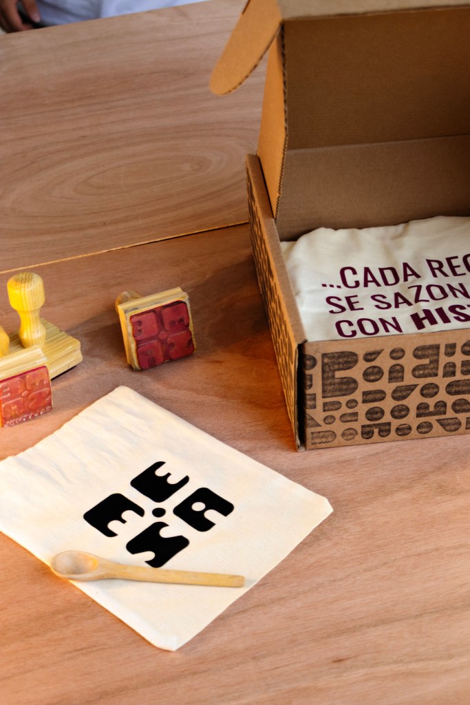 Compuesta por 3 partes, la playera con el isotipo y por la parte de atrás, la frase: Cada receta se sazona con historias compartidas, una gorra y un mandil con el patrón característico de la marca.